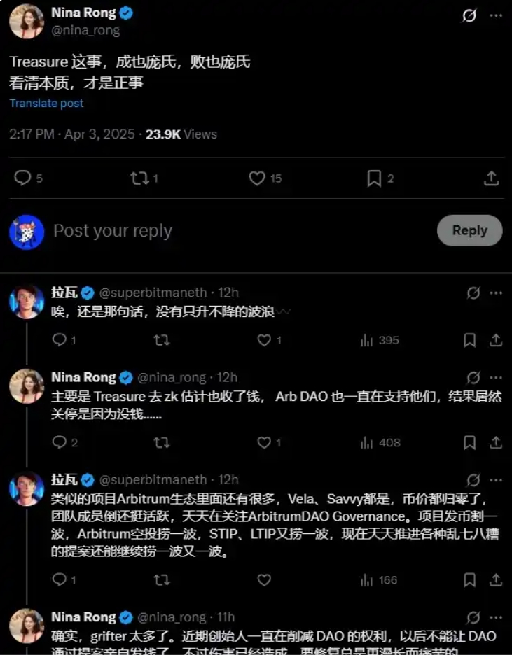 Nina Rong, chính thức Arbitrum cũng bình luận về những khó khăn tài chính của TreasureDAO: