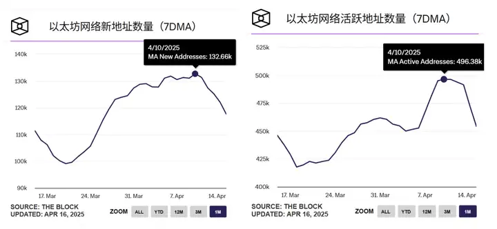 Theo dữ liệu của The Block, từ ngày 10/4, số lượng địa chỉ mới và địa chỉ hoạt động của mạng Ethereum đều giảm mạnh, đồng thời, phí giao dịch trung bình của Ethereum cũng giảm từ 0,86 USD xuống 0,63 USD, hoạt động mạng thu hẹp một cách nhanh chóng.