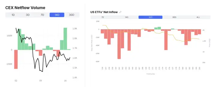 Từ tình hình dòng tiền của Ethereum trên CEX và hiệu suất của spot ETF, xu hướng tổng thể cũng không mấy khả quan. Spot ETF của Ethereum đã gần như ở trạng thái chảy ra ròng trong 30 ngày liên tiếp, thị trường liên tục rút vốn. Đồng thời, trong 14 ngày qua, lượng ETH vào CEX rõ ràng cao hơn lượng chảy ra, một lượng lớn ETH được chuyển vào sàn giao dịch, phát ra tín hiệu áp lực bán ra.
