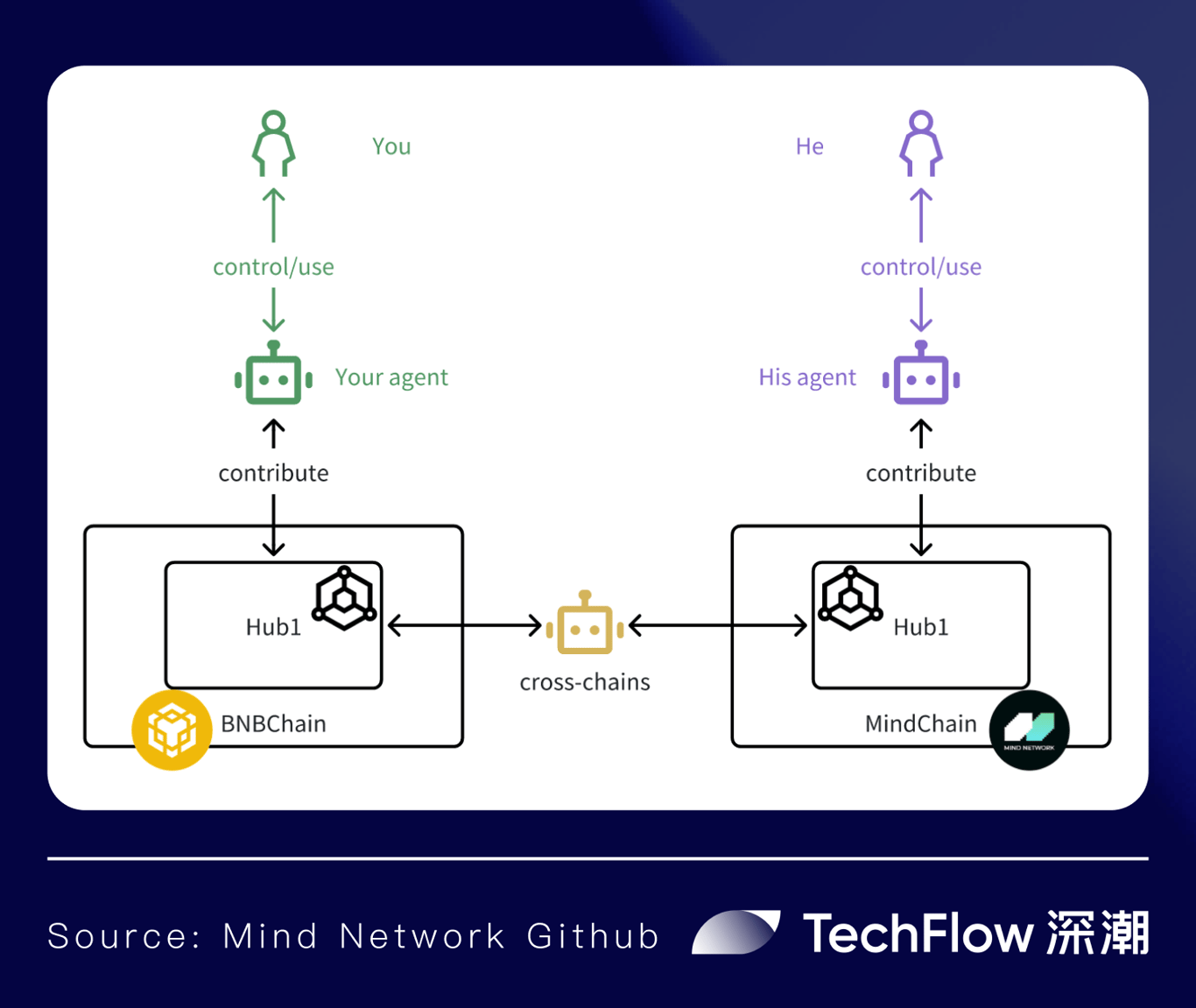 Trong AgenticWorld, Agentic AI từ Chuỗi khác nhau có thể đăng ký cùng một Hub để đóng góp. Ví dụ: Agentic AI từ BNB Chain và Agentic AI từ MindChain đều có thể đăng ký Hub 1.