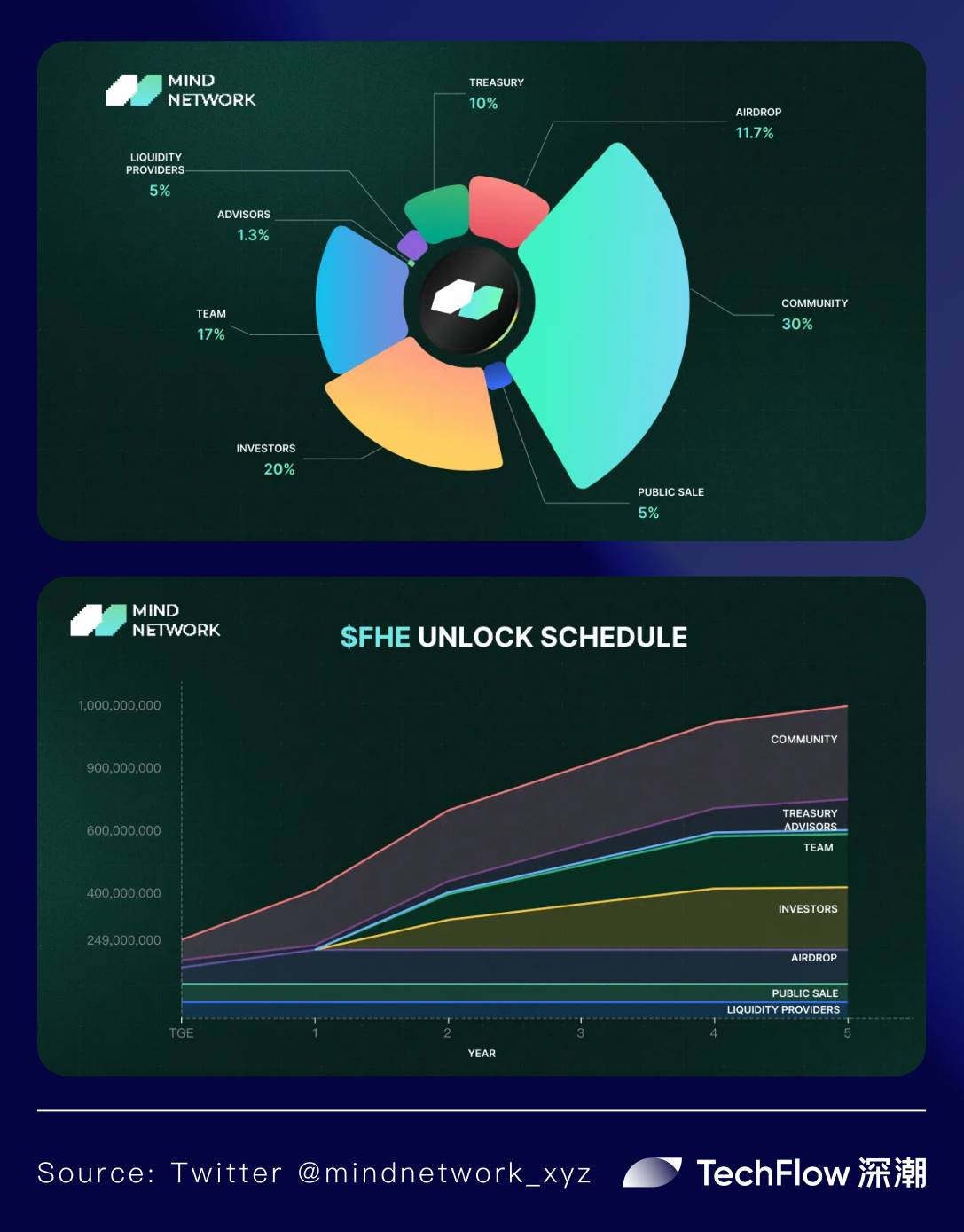 Chúng ta có thể thấy rằng thị phần $FHE thuộc về các nhà đầu tư, đội ngũ và cố vấn đều được thiết lập với thời hạn sở hữu là 48 tháng và thời hạn đóng băng là 12 tháng, trong khi các phần dành cho cộng đồng như đợt airdrop đầu tiên và chào bán công khai được mở khóa tại TGE. Sự chênh lệch múi giờ giữa cộng đồng và dự án không chỉ phản ánh đầy đủ sự tôn trọng của Mind Network đối với các nguyên tắc cộng đồng mà còn truyền tải quyết tâm của dự án trong việc đào sâu phát triển lâu dài và tiếp tục xây dựng.