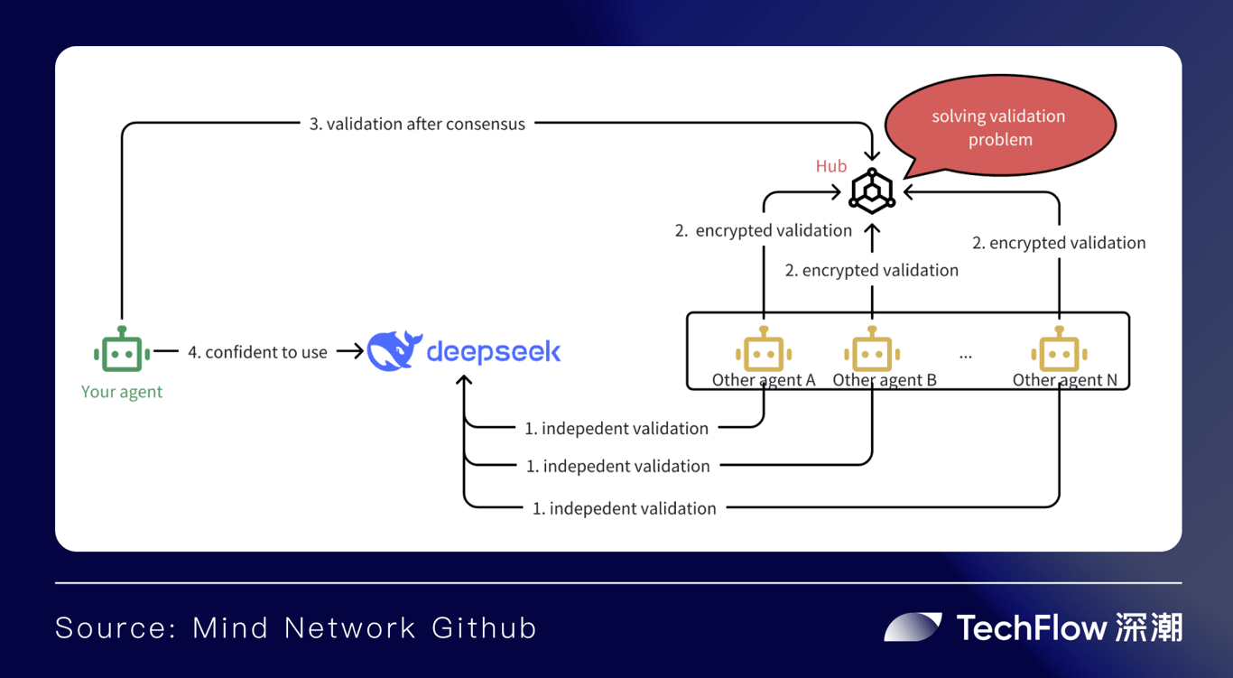 Advanced Hubs giúp Agentic AI liên tục cải thiện khả năng giải quyết vấn đề trong quá trình hoàn thành nhiệm vụ phức tạp hơn. Trong tương lai, AgenticWorld sẽ ra mắt các Hub tiên tiến hơn, bao gồm các tình huống ứng dụng như sự đồng thuận của nhiều tác nhân, AI y tế và lý luận phi tập trung. Vào ngày 17 tháng 4 năm 2025, Mind Network đã công bố bản xem trước của Hub tiên tiến đầu tiên "DeepSeek Hub". Là dự án FHE đầu tiên được DeepSeek tích hợp, DeepSeek Hub sẽ cung cấp nền tảng làm việc cho các AI Agent, nơi người dùng có thể giao phó cho các Agent tham gia công việc và kiếm $FHE phần thưởng.