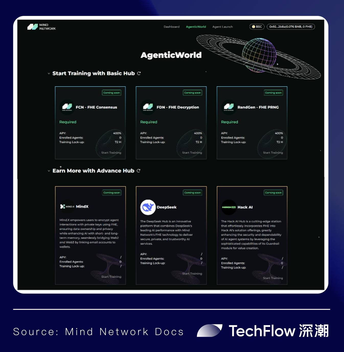 Hub cơ bản giúp Agentic AI có được các khả năng cần thiết để hoạt động trong khuôn khổ AgenticWorld. Các trung tâm đào tạo cơ bản hiện đang được phát triển bao gồm FCN (sự đồng thuận FHE), FDN (giải mã FHE) và RandGen (tạo số ngẫu nhiên). Phần thưởng có thể nhận được bằng cách hoàn thành khóa đào tạo và APY dự kiến hiện tại có thể đạt tới 400%.