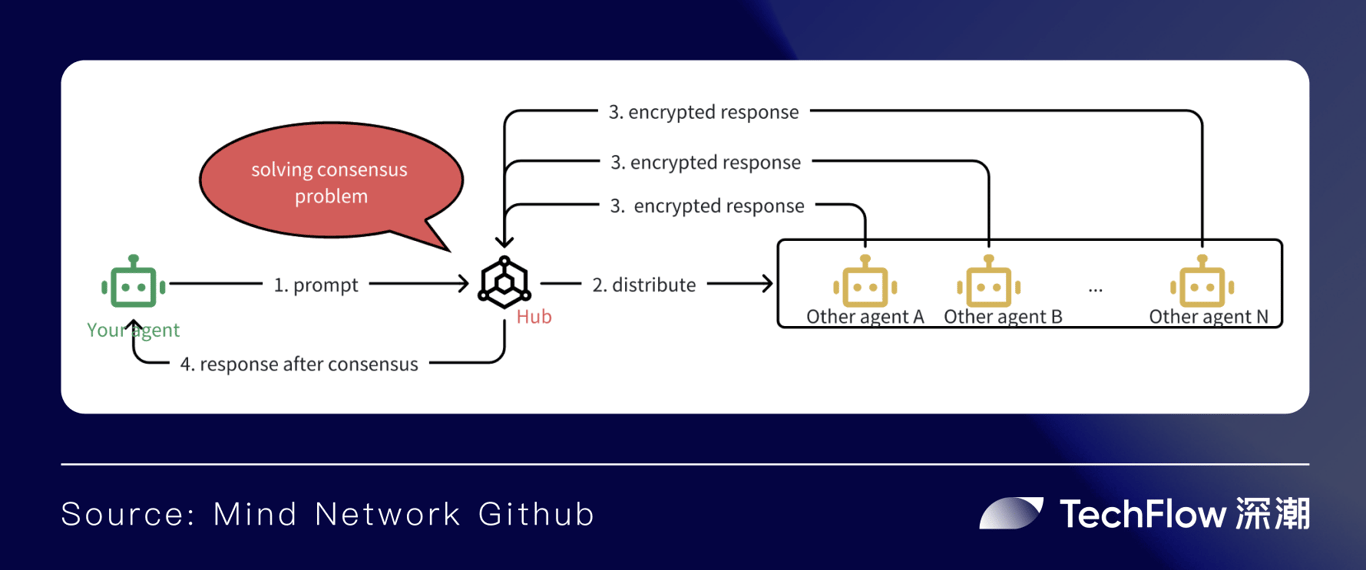 Hub sử dụng cơ chế đồng thuận an toàn của Mind Network dựa trên FHE để so sánh kết quả và đạt được sự đồng thuận về kết quả tối ưu, đảm bảo rằng quyết định không cần tin cậy, có thể xác minh và không thể giả mạo.