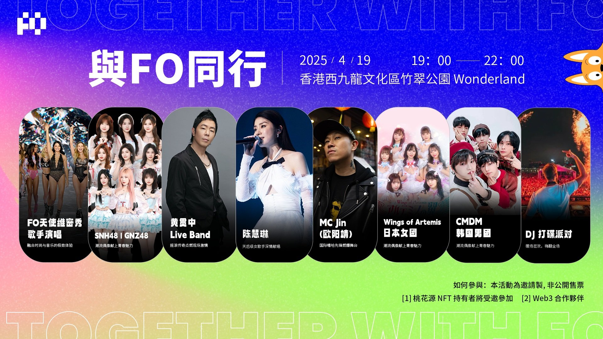 Ngày 19 tháng 4, sự kiện “Đi bộ cùng FO” sẽ được tổ chức tại Wonderland, Công viên Bamboo Tsui, Khu văn hóa Tây Cửu Long, Hồng Kông. Lần này, nhiều khách mời quan trọng từ các khu vực nói tiếng Hoa đã được mời, chẳng hạn như Kelly Chen, Paul Wong, MC Jin, v.v. Các thần tượng có tiếng SNH48 và Wings of Artemis cũng đã được mời. Ngoài ra còn có tiệc DJ để đội hình biểu diễn sang trọng có thể thỏa mãn mọi trải nghiệm về thính giác và thị giác của bạn cùng một lúc.