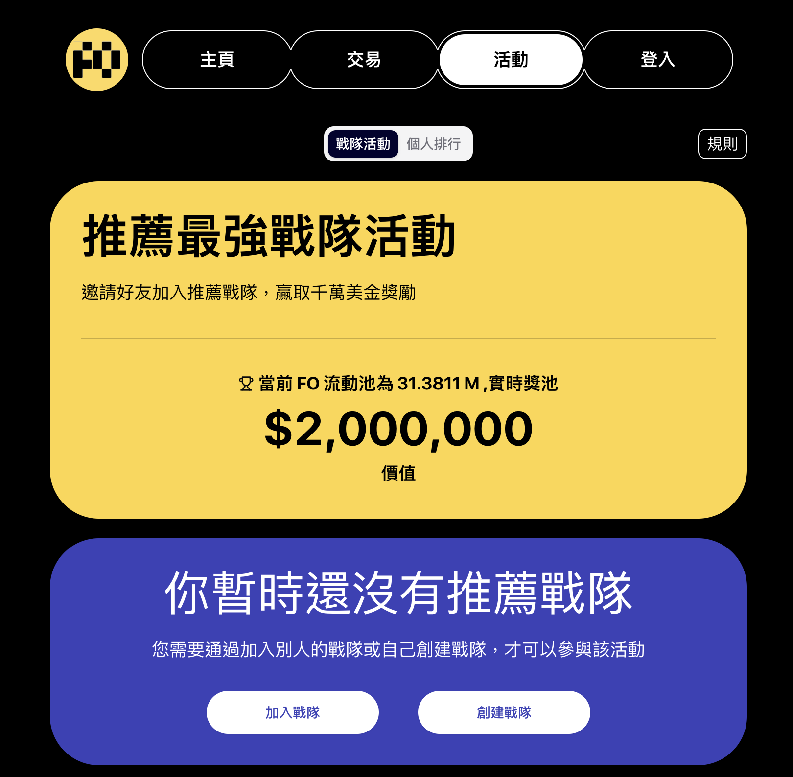 Và $FO cũng đã triển khai hệ thống thi đấu kép (thi đấu cá nhân + thi đấu đồng đội) và đã thu hút được sự chú ý của một nhóm cộng đồng. Tính đến nay, trò chơi đã thu hút hơn 46.000 người dùng tham gia và tổng giải thưởng theo thời gian thực lên tới 2.000.000 đô la Mỹ.