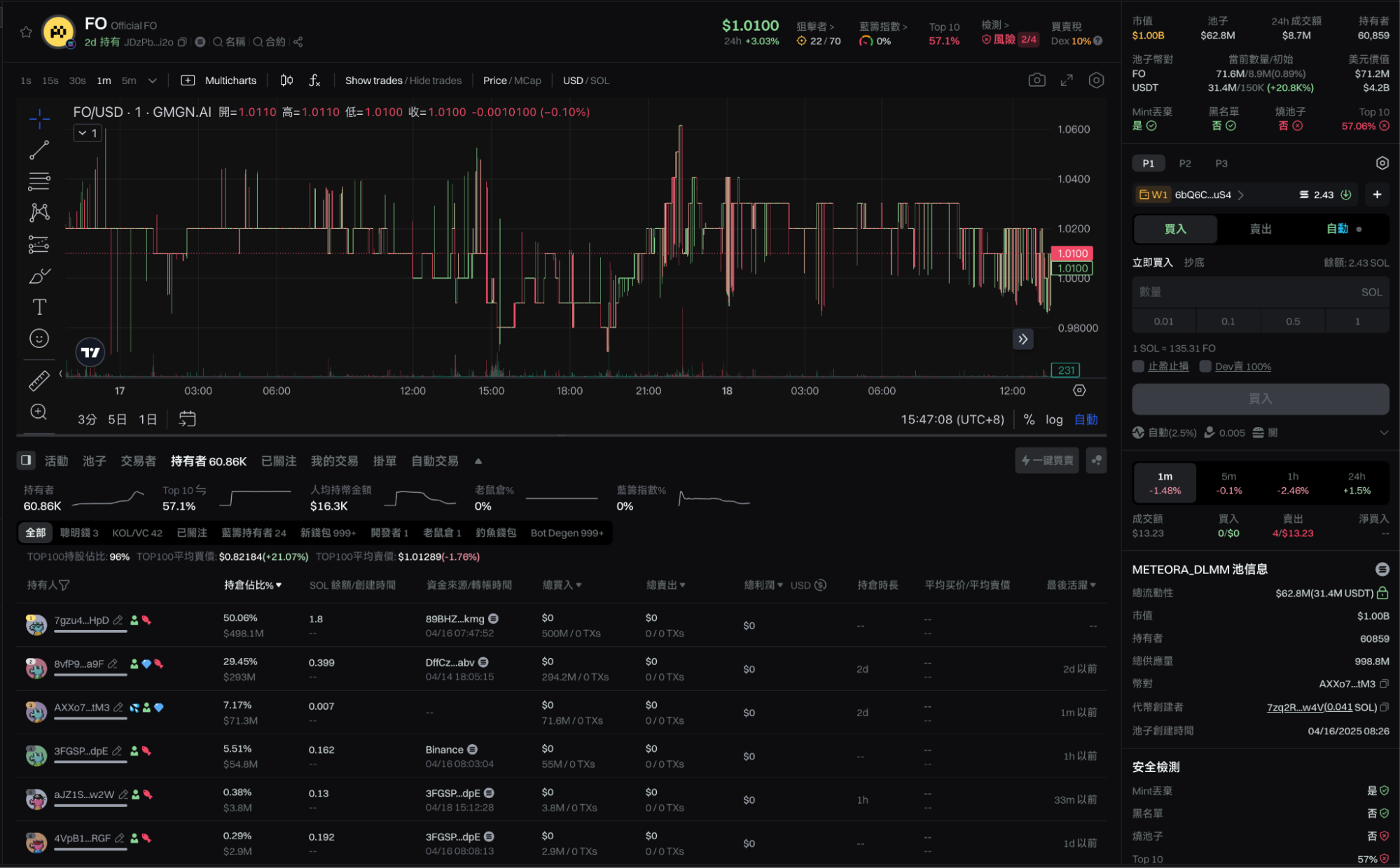 Sau khi $FO ra mắt vào ngày 16 tháng 4, theo biểu đồ giá gmgn, định giá pha loãng hoàn toàn (FDV) đã vượt quá 1 tỷ đô la Mỹ và tăng khoảng 15% sau khi mở cửa. Giá tại thời điểm viết bài là 1,0 đô la và tổng thanh khoản của nhóm là khoảng 71,6 triệu đô la. Đồng thời, tổng số người tham gia hiện tại vào khoảng 60,88 nghìn.