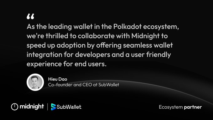 Nửa đêm 🤝 @subwalletapp Việc tích hợp của SubWallet sẽ là một phần của nỗ lực rộng lớn hơn nhằm tăng tốc độ áp dụng và hỗ trợ các nhà phát triển xây dựng các ứng dụng phi tập trung (DAPPS) bảo vệ dữ liệu trên các nền tảng dựa trên Polkadot SDK. 🔗 Đọc thêm về các tích hợp ví tự quản của Midnight: midnight.network/blog/looking-...…