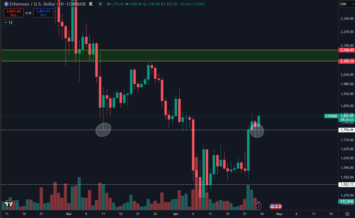 $ETH đang lật ngược một mức ngang trước đây thành hỗ trợ. Đây là một sự thay đổi trong động lực thị trường của ETH, điều mà nó đã không làm trong nhiều tháng qua. Hãy để ý đến khoảng ~$1750-$2100. twitter.com/DaanCrypto/status/...