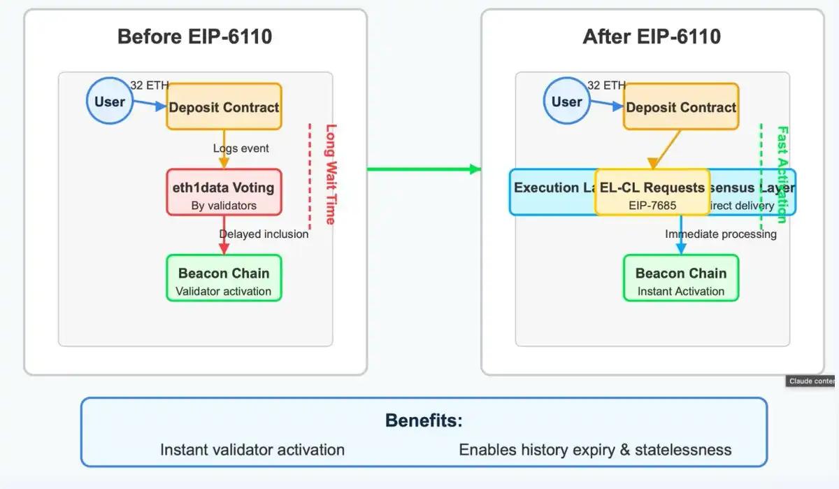 Đề xuất này cho phép tiền gửi của người xác thực được đưa trực tiếp vào khối, từ đó tăng tốc quá trình staking và giảm thời gian chờ đợi cho các người xác thực mới.
