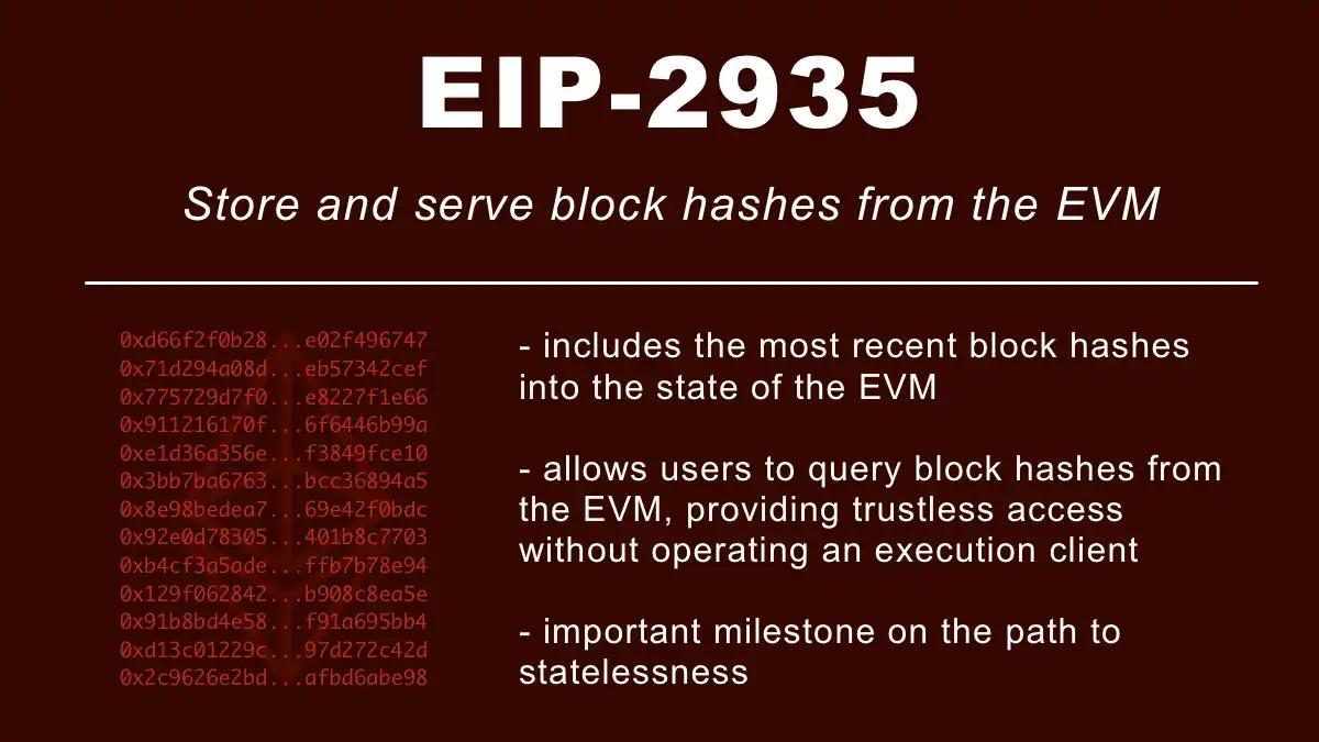 Đề xuất này thêm một hợp đồng hệ thống để truy xuất hash khối lịch sử (lên đến 8.192 khối), giải quyết vấn đề giới hạn 256 khối của mã vận hành BLOCKHASH hiện tại.