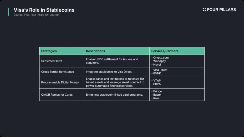 Visa vận hành một trong những mạng lưới thanh toán lớn nhất thế giới, VisaNet, có thể xử lý tới 65.000 giao dịch mỗi giây và hỗ trợ thanh toán tại 150 triệu đơn vị chấp nhận thẻ ở hơn 200 quốc gia. Visa coi stablecoin là thành phần cốt lõi của hệ thống thanh toán kỹ thuật số trong tương lai và đã công bố bốn sáng kiến chiến lược cụ thể vào tháng 4 năm nay để tích hợp stablecoin vào các mạng thanh toán hiện có.