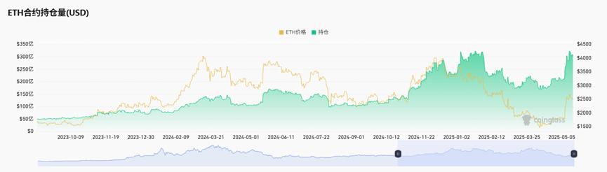 Mặc dù đợt tăng giá gần đây vẫn còn cách khá xa so với mức cao nhất lịch sử, nhưng khối lượng mở hợp đồng lại đạt mức cao kỷ lục gần đây. Ngày 14/5, khối lượng mở hợp đồng Ethereum đạt 32,249 tỷ đô la, gần như mức khối lượng mở hợp đồng cao nhất lịch sử. Lần cuối cùng khối lượng hợp đồng đạt mức này là vào tháng 1-2/2025, khi giá Ethereum dao động trong khoảng 3.000-3.800 đô la. Từ đó có thể thấy, thị trường vẫn rất nhiệt tình với việc đặt cọc trên Ethereum.