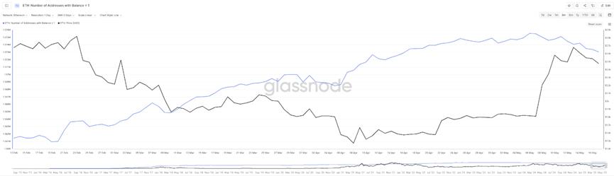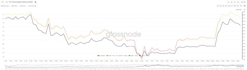 Theo dữ liệu của Glassnode, cũng bắt đầu từ cuối tháng 4, chỉ số "Lợi nhuận/Lỗ chưa thực hiện ròng" (Net Unrealized Profit/Loss, viết tắt NUPL) của Ethereum mới đảo chiều trở lại dương, trước đó từ ngày 1/4 đến 22/4, chỉ số NUPL liên tục âm. Trong giai đoạn này, giá Ethereum đã rơi xuống dưới 1.800 đô la, thấp nhất xuống đến 1.385 đô la, nghĩa là khi giá Ethereum xuống dưới 1.800 đô la, các địa chỉ nắm giữ về cơ bản đều ở trạng thái lỗ vốn. Tuy nhiên, dữ liệu âm này đôi khi cũng cho thấy tín hiệu đáy thị trường, bởi áp lực bán gần như cạn kiệt ở giai đoạn này. Tuy nhiên, tính đến ngày 17/5, chỉ số NUPL cao nhất đạt 0,328, từ khoảng giá trị nhìn vào, vẫn ở giai đoạn đầu hoặc phục hồi của thị trường bò, chưa đạt đến giai đoạn cực kỳ lạc quan.