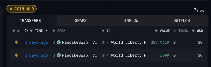 四小时前 WLFI 花费 2.5 万枚 USD1 买入 $B ,使得币价短时暴涨 271%,市值突破 1.2 亿美元🔥