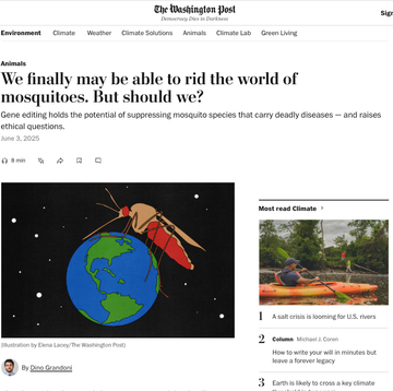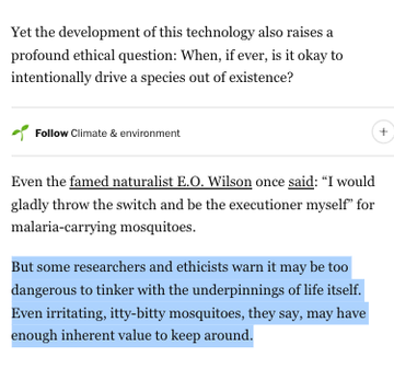 Appreciate this coverage of gene drives but some of the points here are wild... crazy to focus on the "inherent value" of 1 out of 3,500 species of mosquitoes when almost half a million children die each year from malaria. What about their inherent value?