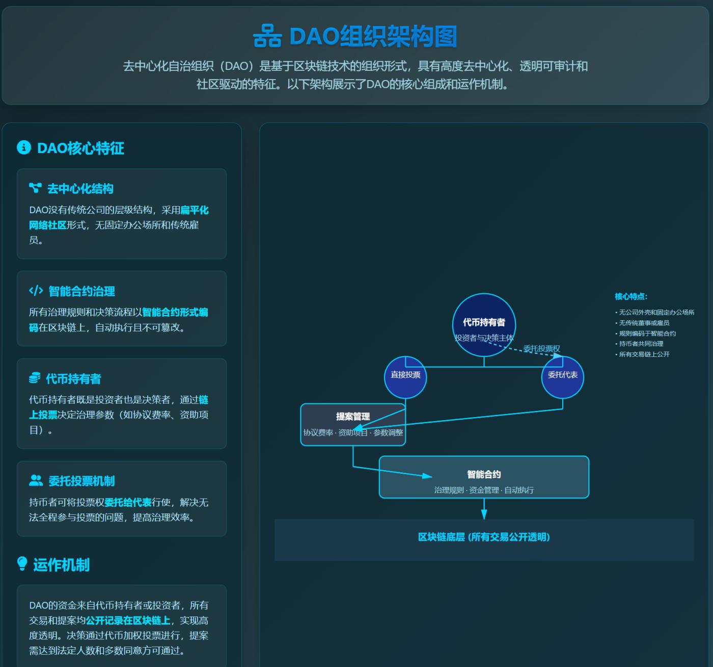 Tích hợp độ sâu công nghệ và quản trị : Trong tương lai, DAO dự kiến sẽ giới thiệu các cơ chế quản trị chuyên nghiệp hơn, chẳng hạn như các ủy ban chuyên gia, cơ cấu ra quyết định đa cấp và hệ thống quản lý rủi ro , đồng thời vẫn duy trì những lợi thế của phi tập trung , nhằm đạt được sự cải thiện kép về đổi mới công nghệ và mức độ trưởng thành về quản trị. Sự kết hợp giữa hợp đồng thông minh và các phương thức quản trị truyền thống sẽ tạo ra một mô hình vận hành tổ chức mới.
