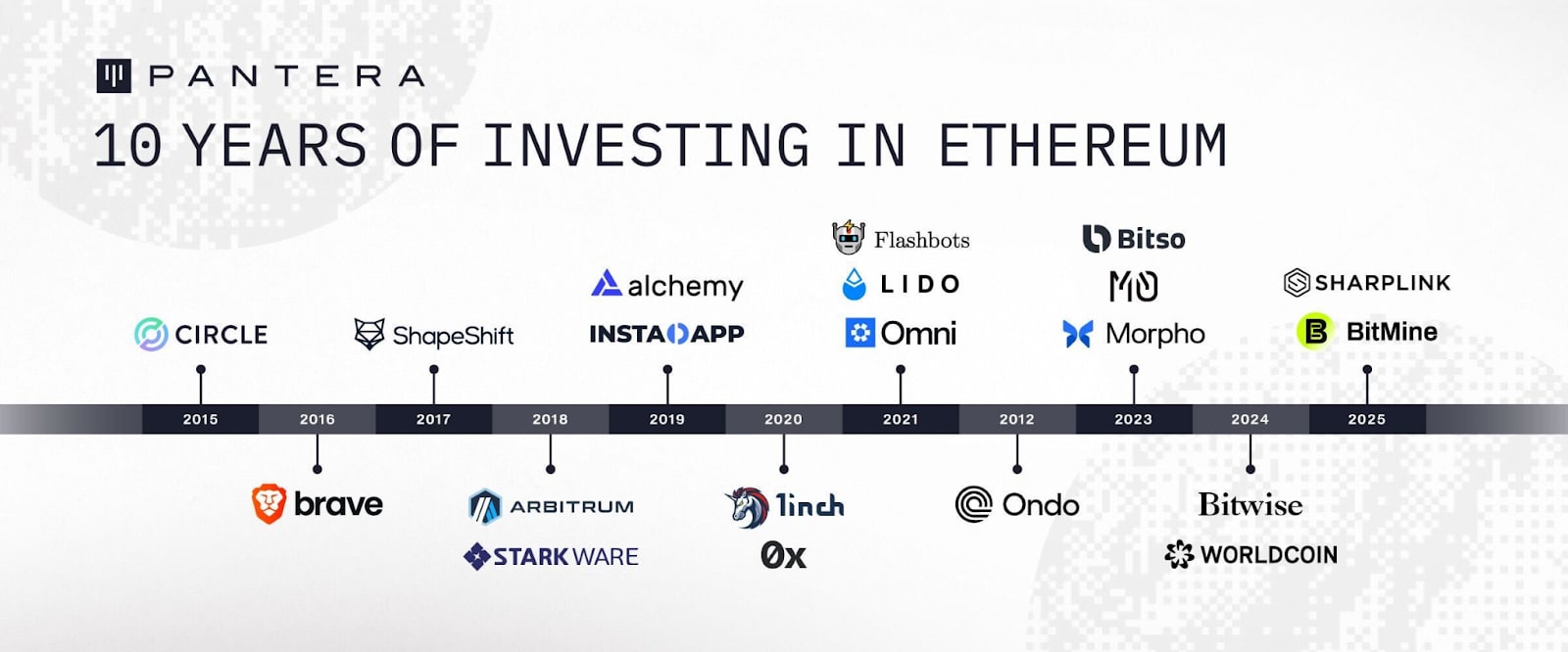 Trong thập kỷ qua, Pantera Capital đã liên tục đầu tư vào hệ sinh thái Ethereum, hỗ trợ các dự án và nhà sáng lập mang tính chuyển đổi. Chúng tôi là một trong số rất ít công ty liên tục đầu tư cùng với sự phát triển Ethereum. Các khoản đầu tư chính bao gồm Circle, công ty cung cấp hỗ trợ cho USDC. USDC là một stablecoin hàng đầu với giá trị vốn hóa thị trường vượt quá 60 tỷ đô la và là động lực thúc đẩy việc áp dụng Ethereum trong DeFi và thanh toán. Arbitrum, một giải pháp Layer 2 hàng đầu, đã nắm bắt được 100% tăng trưởng giao dịch gia tăng Ethereum cho đến năm 2023, mang lại tốc độ xử lý giao dịch nhanh hơn 40 lần và chi phí thấp hơn 20 lần. Kể từ khi ra mắt, giải pháp này đã xử lý hơn 1,89 tỷ giao dịch và đạt khối lượng DEX tích lũy vượt quá 545 tỷ đô la, chứng minh mở rộng của Ethereum . Trong những năm gần đây, Pantera Capital đã trở thành một nhân tố chủ chốt trong việc di chuyển cơ sở hạ tầng vốn, hỗ trợ việc phát hành token cổ phần của Robinhood trên Arbitrum và đóng vai trò là cơ sở hạ tầng cơ bản cho Robinhood Chain. Ondo đã có những đóng góp đáng kể cho thị trường trái phiếu kho bạc token hóa hàng tỷ đô la và ra mắt USDY vào năm 2023, làm nổi bật vai trò quan trọng Ethereum như là cơ sở hạ tầng cốt lõi kết nối tài sản trong thế giới thực như Kho bạc Hoa Kỳ với tài chính trên Chuỗi . Morpho đã cải thiện đáng kể trải nghiệm vay mượn trên Ethereum , đạt gần 1 tỷ đô la tiền gửi chỉ một năm sau khi ra mắt , khiến nó trở thành một trong những giao thức DeFi nhanh nhất đạt được cột mốc này. Pantera đã tham gia vào vòng hạt giống của ETF spot Ethereum của Bitwise, một trong những ETF được chấp thuận đầu tiên, mở ra một kênh mới cho dòng vốn đầu tư của tổ chức. Tính đến năm 2025, Bitwise đã quản lý hơn 4 tỷ đô la tài sản , tận dụng công nghệ blockchain của Ethereum để thúc đẩy các chiến lược DeFi và tài sản được token hóa. Cuối cùng, BitMine, hợp tác với các công ty như Bit Digital, đã bổ sung hơn 840.000 ETH vào kho bạc doanh nghiệp của mình, thể hiện cam kết của mình đối với giá trị Ethereum như một tài sản dự trữ.