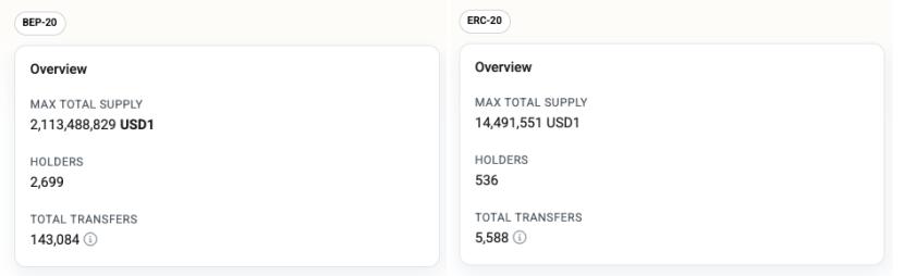 (Hình 2: So sánh USD1 trên chuỗi BNB (BEP-20) và Ethereum (ERC-20). Nguồn: BscScan, Etherscan)