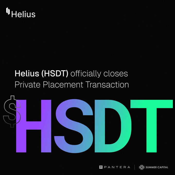 Helius $HSDT, in Partnership with @PanteraCapital and Summer Capital Closes Over $500 Million Private Placement to Launch Solana Treasury Company