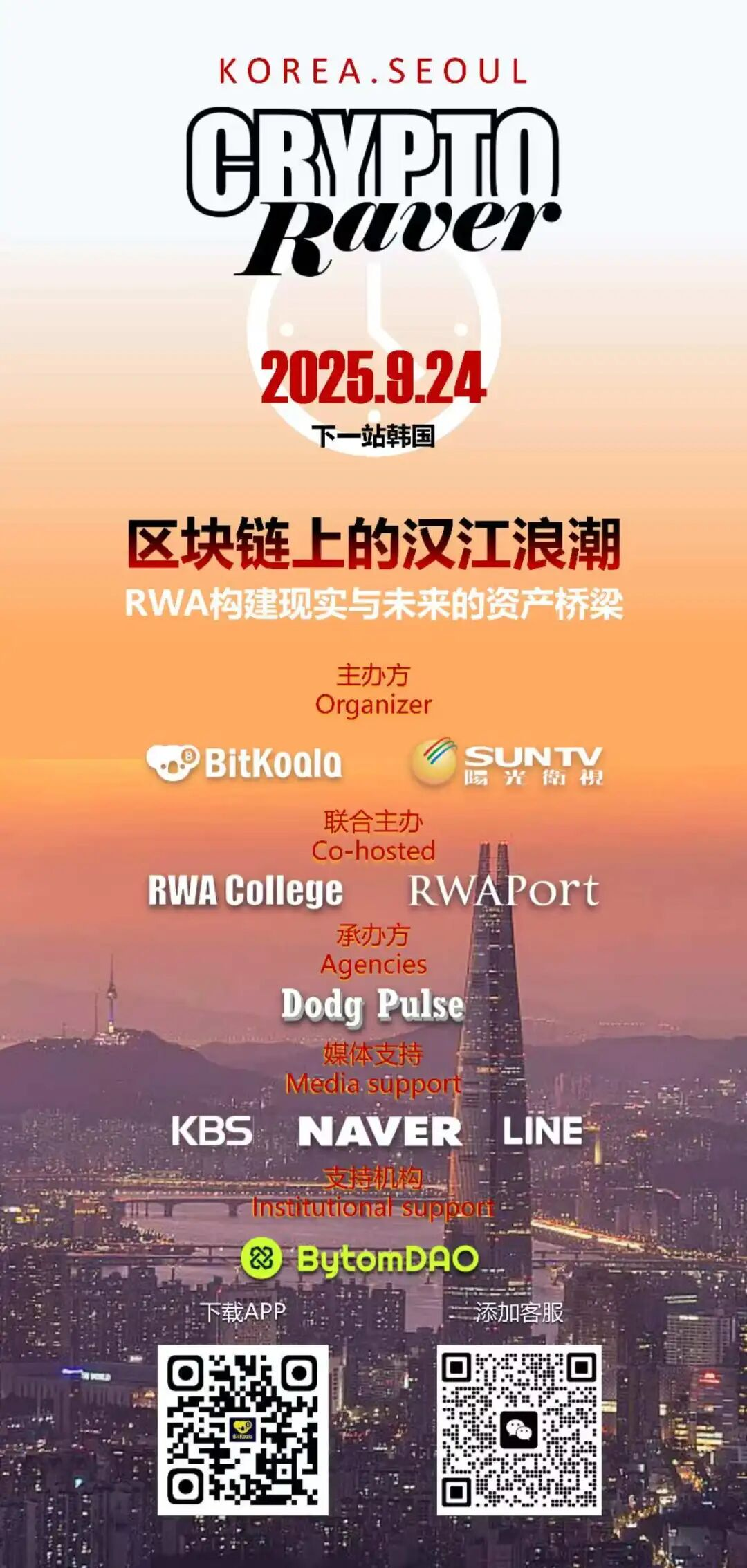 Hội nghị lần có chủ đề "Làn sóng sông Hàn trên Blockchain: RWA xây dựng cầu nối giữa hiện thực và tương lai tài sản". Hội nghị sẽ quy tụ các nhà lãnh đạo từ các lĩnh vực blockchain, tài chính và công nghệ toàn cầu để thảo luận về các hoạt động và thách thức của RWA trong số hóa tài sản, lưu thông toàn cầu, tuân thủ quy định và định giá. Hội nghị sẽ bao gồm quan điểm chuyên ngành, trình diễn công nghệ tiên tiến, kết nối dự án và đàm phán hợp tác, và mở cửa cho các nhà phát triển, nhóm dự án, tổ chức đầu tư và người hành nghề trong ngành.