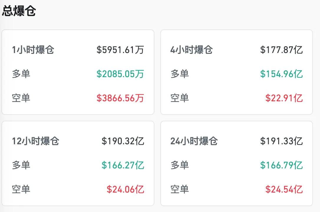 Dữ liệu coinglass cho thấy tính đến 8:00 sáng ngày 11, tổng giá trị cháy tài khoản trong 24 giờ đạt 19,1 tỷ đô la Mỹ, và 1,62 triệu người trên toàn thế giới đã bị thanh lý. Cháy tài khoản đơn lẻ lớn nhất xảy ra ở Hyperliquid - ETH-USDT, trị giá 203 triệu đô la Mỹ.