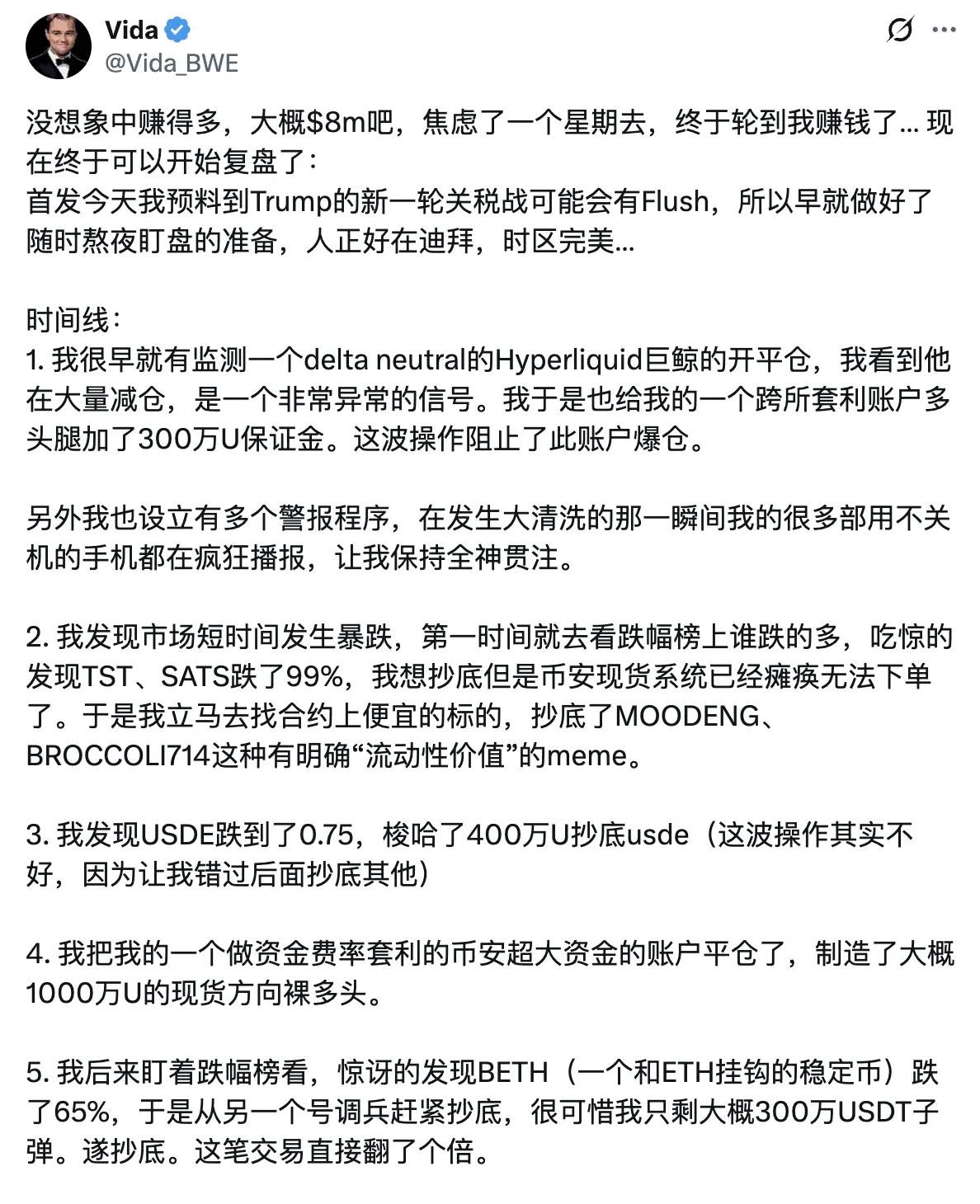 Sau khi thị trường phục hồi tương đối, nhiều KOL bắt đầu khoe lợi nhuận trên X Mingpai. Ví dụ, Vida (@Vida_BWE) trực tiếp tiết lộ rằng lợi nhuận qua đêm của anh là khoảng 8 triệu đô la Mỹ.