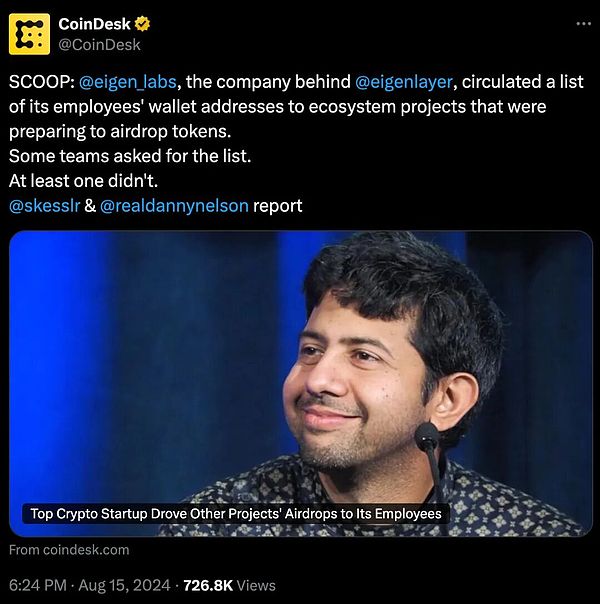 Rồi đến vụ bê bối xung đột lợi ích. Vào tháng 8 năm 2024, CoinDesk đưa tin rằng nhân viên của Eigen Labs đã nhận được gần 5 triệu đô la tiền airdrop từ các dự án được xây dựng trên Eigen nLayer. Nhân viên đã cùng nhau nhận hàng trăm nghìn token từ các dự án như EtherFi, Renzo và Altlayer. Ít nhất một dự án, dưới áp lực, đã đưa nhân viên của mình vào danh sách phân phối.