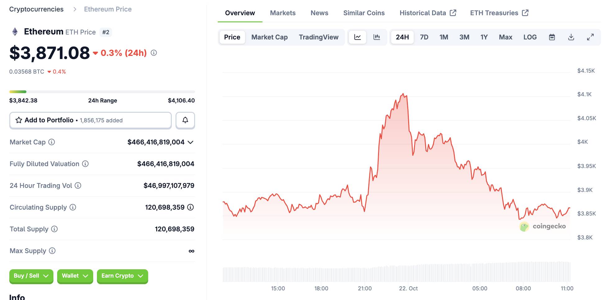 Biến động giá ETH trong 24 giờ qua, ảnh chụp màn hình trên CoinGecko lúc 11:15 AM ngày 22/10/2025