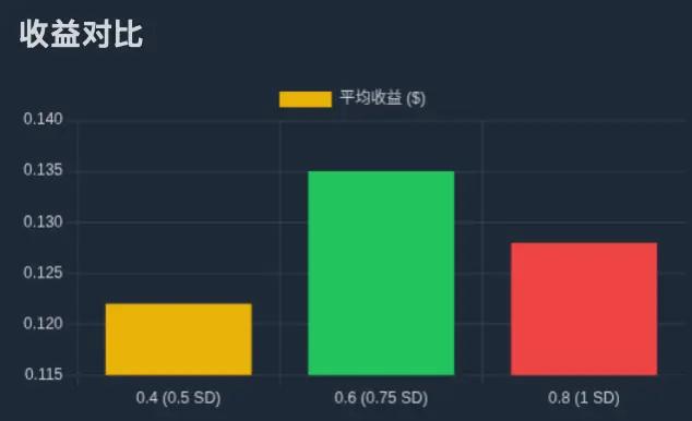 - B. Tương quan giữa Chênh lệch giá, Xác suất và Lợi nhuận kỳ vọng Dựa trên điều này, chúng ta có thể suy ra xác suất thực hiện lệnh ở các mức chênh lệch giá khác nhau và tính toán lợi nhuận kỳ vọng của chúng. Ví dụ: nếu chúng ta đặt mức chênh lệch giá là 0,8 đô la (tức là đặt lệnh ở mức 0,4 đô la ở cả hai phía của giá trị trung bình), giá phải dao động ít nhất một độ lệch chuẩn để kích hoạt lệnh, với xác suất khoảng 32%. Giả sử lần thực hiện lệnh chiếm một nửa mức chênh lệch giá (0,4 đô la), lợi nhuận kỳ vọng theo từng khoảng thời gian là khoảng 0,128 đô la (32% × 0,4 đô la).