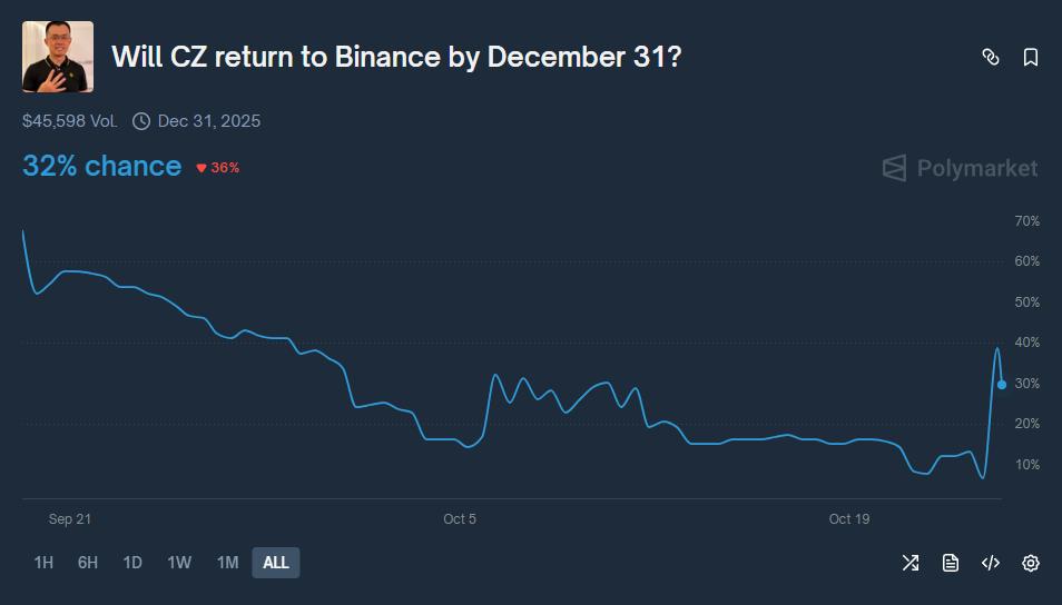 Trên Polymarket, nền tảng dự đoán phi tập trung nổi tiếng, đã có 69% nhà giao dịch đặt cược rằng ông sẽ trở lại Binance trước ngày 31/12/2025, với tổng số tiền đặt cược hơn 32.000 USD. Hiện tại con số đã giảm xuống mức 32%