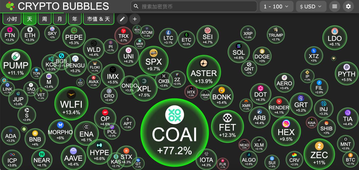 Những đồng tiền điện tử có mức tăng trưởng lớn nhất trong số 100 đồng tiền điện tử hàng đầu theo giá trị vốn hóa thị trường hiện nay: ChainOpera AI tăng 77,2%, Aster tăng 13,9%, World Liberty Financial tăng 13,4%, ASI Alliance tăng 12,3% và Pump.fun tăng 11,1%.