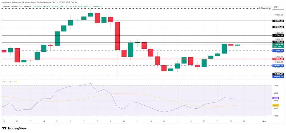 Tuy nhiên, chỉ số RSI (Relative Strength Index) của Bitcoin hiện vẫn nằm trong vùng tích cực, cho thấy động lượng tăng đang mạnh lên. Nếu lực mua được củng cố, BTC hoàn toàn có thể vượt 115.000 USD và hướng tới 117.261 USD trong ngắn hạn.