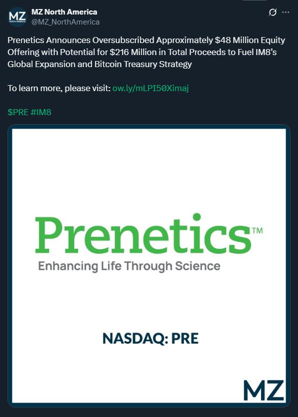 Prenetics Global vừa huy động thành công 48 triệu USD từ các nhà đầu tư trong lĩnh vực tiền mã hóa để tài trợ cho chiến lược mua Bitcoin hàng ngày và mở rộng thương hiệu thực phẩm bổ sung IM8.