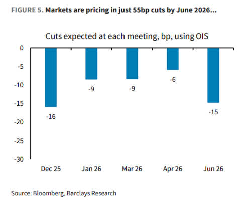Điều này có nghĩa là, xét theo bối cảnh dữ liệu hiện tại, chính sách tiền tệ hạn chế không còn cần thiết nữa. Barclays nhận thấy thị trường hiện chỉ dự đoán lãi suất sẽ giảm tổng cộng 55 điểm cơ bản vào tháng 6 năm 2026, một quan điểm "quá phiến diện".