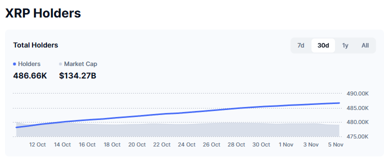 Dữ liệu từ CoinMarketCap cho thấy trong tháng qua, giá XRP đã giảm từ trên 3 đô la xuống còn 2,20 đô la, nhưng số lượng người nắm giữ đã tăng hơn 8.000.