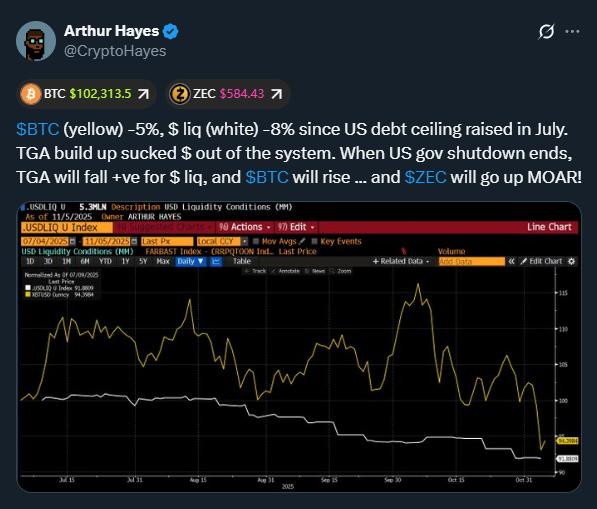 Tuy nhiên, ông dự đoán sự đảo chiều sắp tới — khi chính phủ Mỹ mở cửa trở lại và bắt đầu chi tiêu lượng tiền lớn trong TGA — sẽ đánh dấu khởi đầu cho một dạng “nới lỏng định lượng ngầm”.
