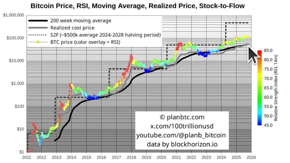 PlanB, cha đẻ mô hình Stock-to-Flow (S2F), xem đợt điều chỉnh này như một điểm nghỉ giữa chu kỳ. Dữ liệu của ông cho thấy Bitcoin đã giữ trên 100.000 USD suốt 6 tháng liên tiếp — một sự chuyển đổi quan trọng từ kháng cự thành hỗ trợ.