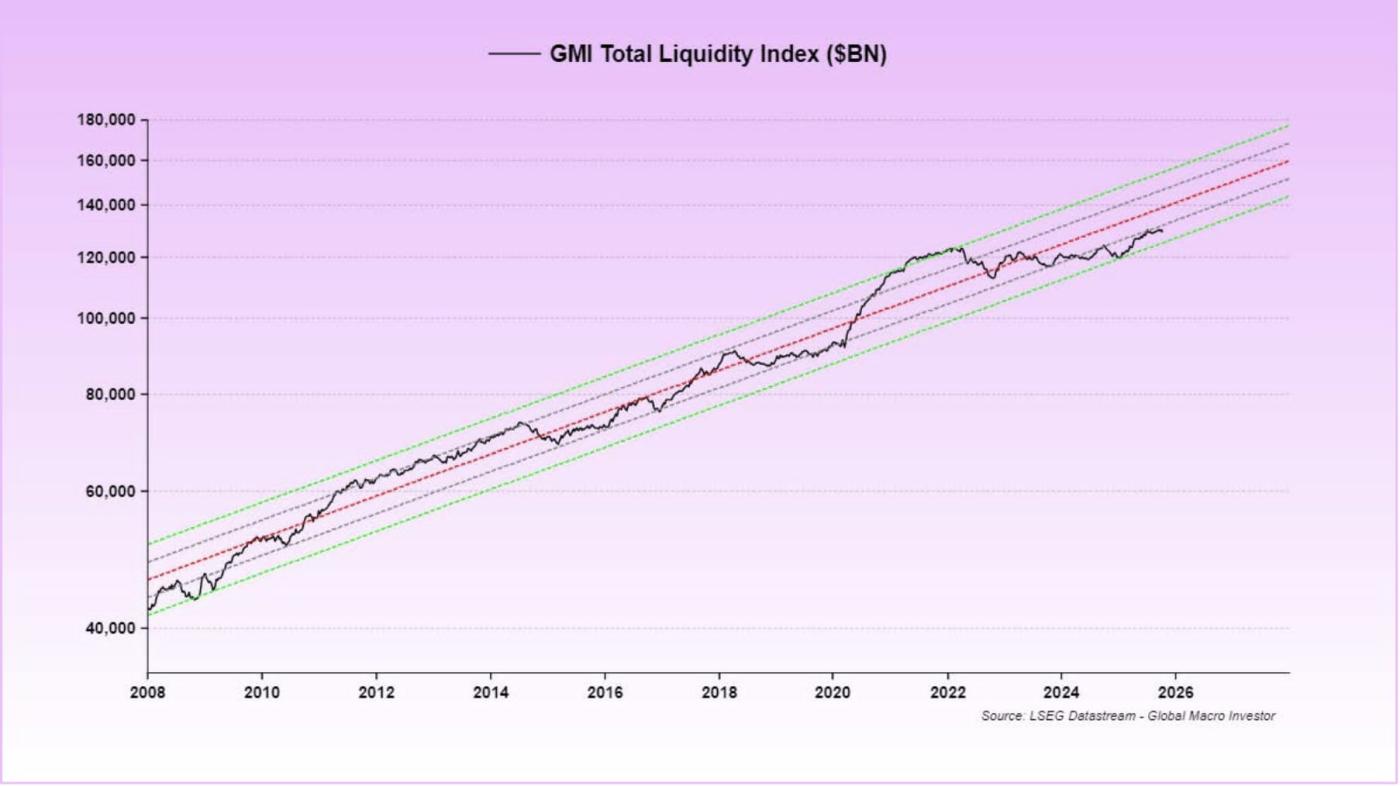Mô hình thanh khoản của Raoul Pal cũng đưa ra bức tranh tương tự. Chỉ số thanh khoản GMI của ông — theo dõi cung tiền và tín dụng toàn cầu — vẫn trong xu hướng đi lên dài hạn.