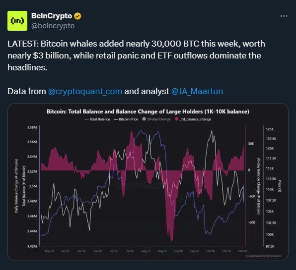 Dữ liệu từ CryptoQuant cho thấy các ví lớn — nắm 1.000 đến 10.000 BTC — đã gom khoảng 29.600 BTC trong tuần qua, trị giá xấp xỉ 3 tỷ USD.