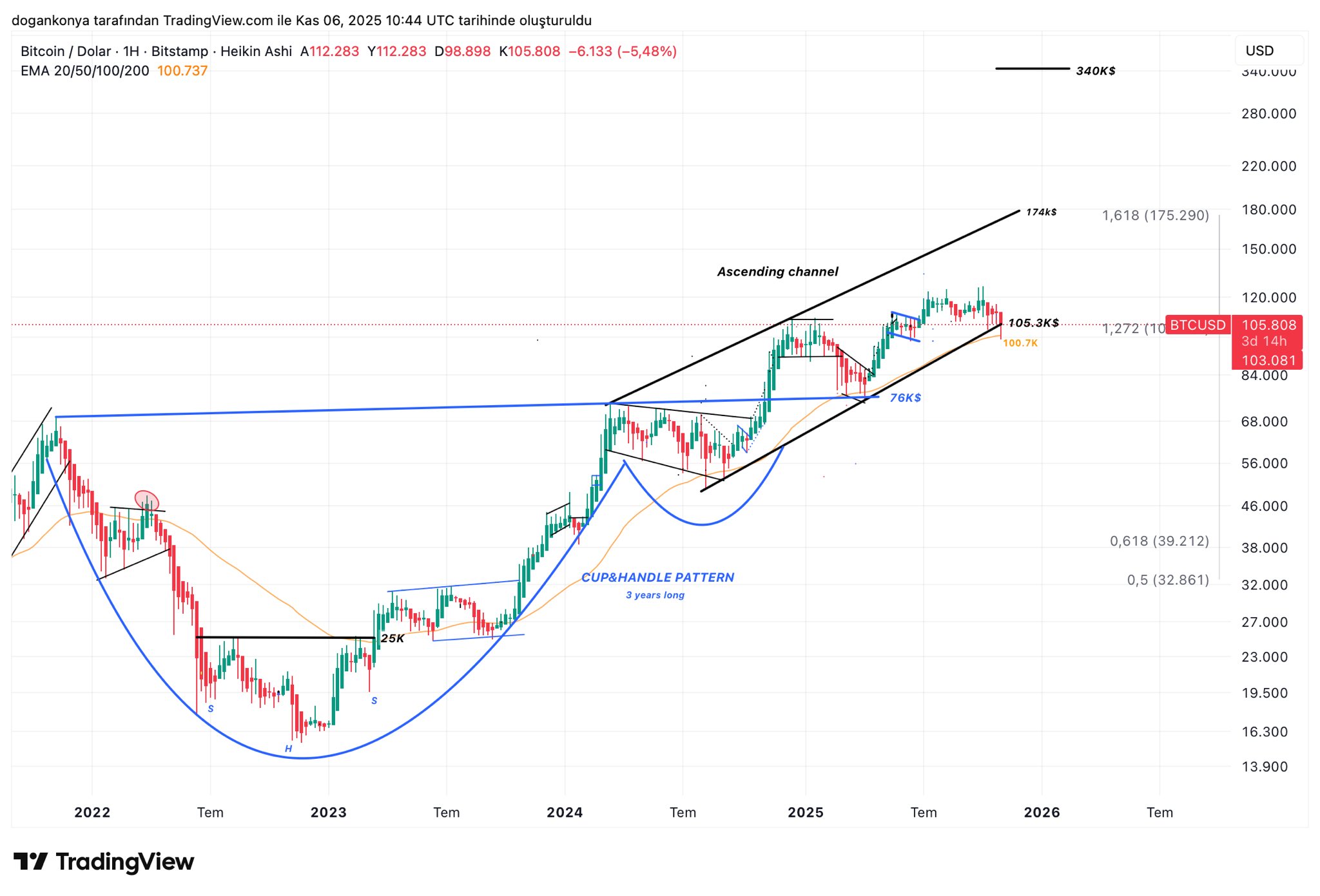 Sau một đợt phục hồi ổn định, phân tích sâu hơn của PlanD cho thấy Bitcoin vẫn duy trì tiềm năng tăng giá mạnh mẽ, với đà tăng hiện tại đang phù hợp với kênh tăng giá bắt đầu từ cuối năm 2024 và dự báo giá có thể tăng lên 176.000 đô la. Đồng thời, mô hình cốc-tay cầm rộng hơn đã phát triển kể từ năm 2023, báo hiệu mục tiêu dài hạn thậm chí còn lớn hơn quanh mức 340.000 đô la, củng cố triển vọng tăng giá cho tài sản này.
