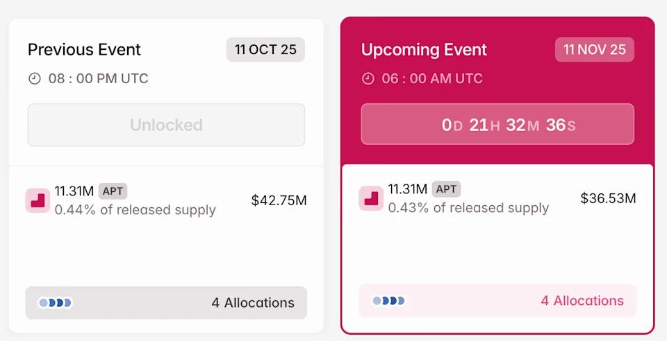 Đội ngũ dự án sẽ mở khóa 11,31 triệu token vào ngày 11/11, trị giá 36,53 triệu USD, chiếm 0,43% lượng lưu hành. Trong đó 3,96 triệu APT dành cho contributor cốt lõi, 3,21 triệu token cho cộng đồng, 2,81 triệu token cho nhà đầu tư, và 1,33 triệu token cho quỹ foundation.