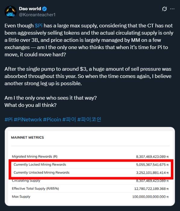 Một tài khoản X tên Dao World, tự nhận là Pioneer, lập luận rằng mặc dù Pi có tổng cung tối đa lớn, nhưng lượng lưu hành thực tế chỉ khoảng 3 tỷ. Anh cho biết thêm rằng đội ngũ Pi Core Team không bán tháo.