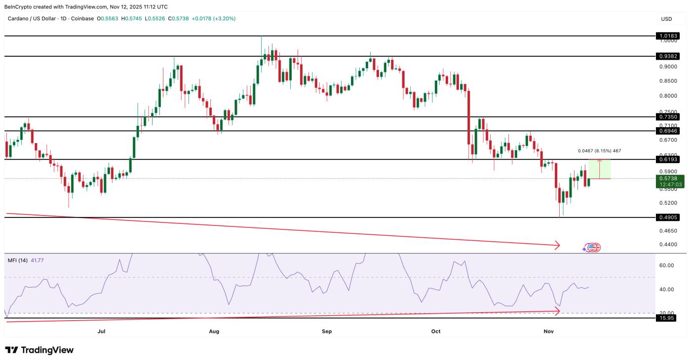 Biểu đồ kỹ thuật cũng thể hiện sự ủng hộ động thái này. ADA đã giảm 41% trong ba tháng qua. Tuy nhiên, từ ngày 05/06 đến 04/11, mức giá tạo ra các đáy thấp hơn trong khi các chỉ báo động lượng tạo ra các đáy cao hơn. Đây là mô hình phân kỳ tăng giá kinh điển thường xuất hiện trước khi đảo ngược xu hướng.
