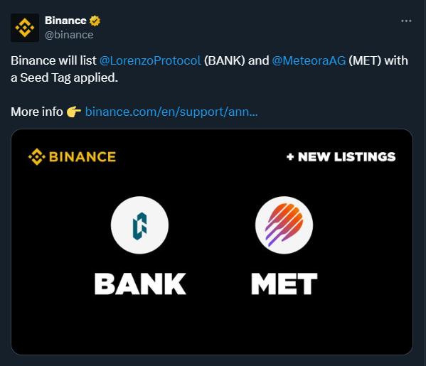Binance đang chuẩn bị niêm yết hai token mới, Lorenzo Protocol (BANK) và Meteora (MET), và thị trường đã phản ứng ngay với thông báo này.