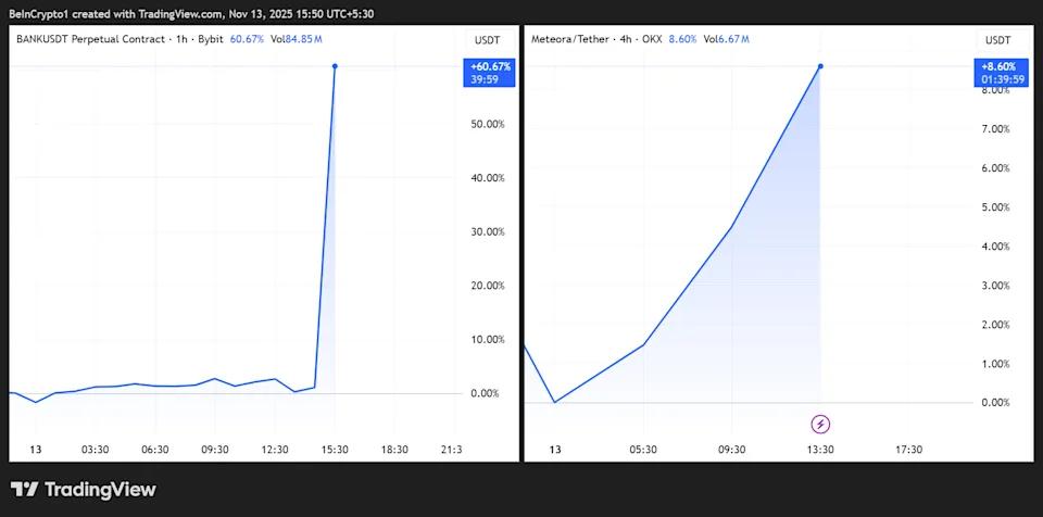 Trước khi niêm yết chính thức lúc 14:00 UTC (chỉ còn gần 4 giờ nữa), BANK đã tăng hơn 60%, trong khi MET tăng gần 10%.