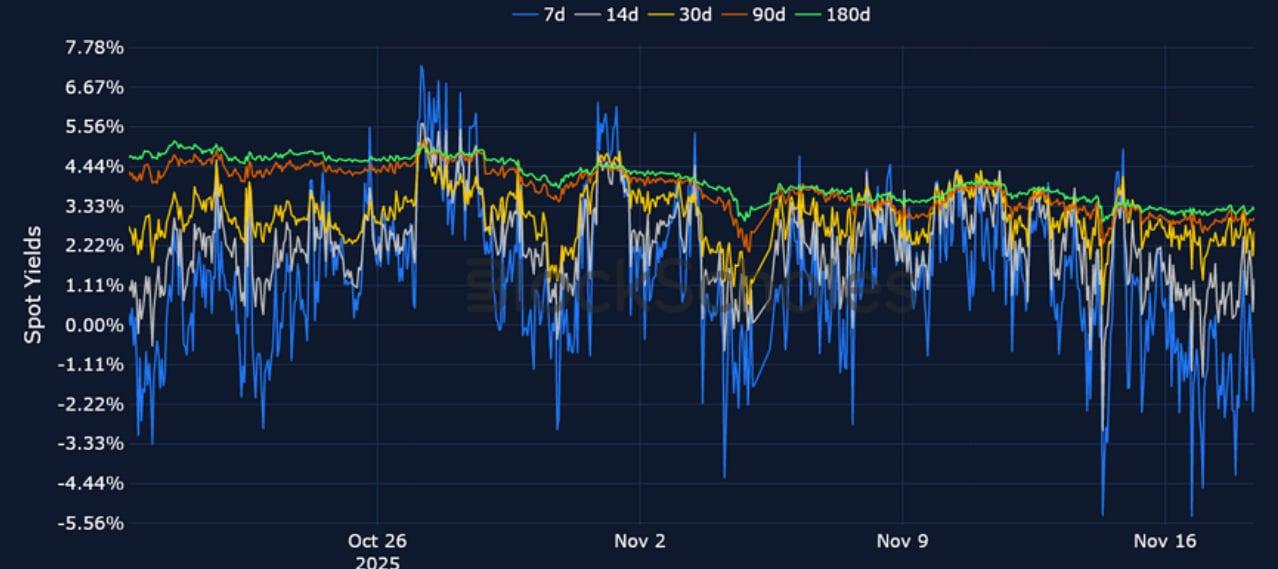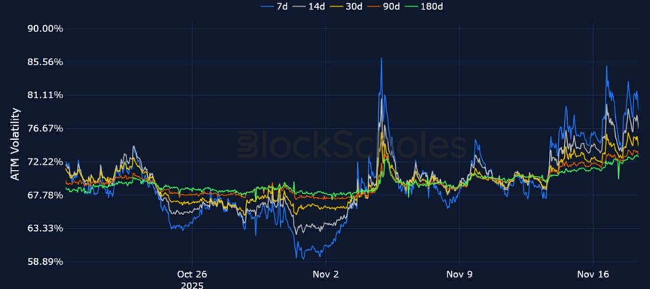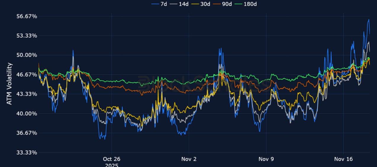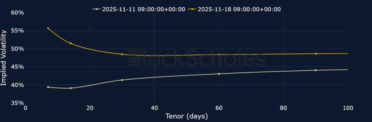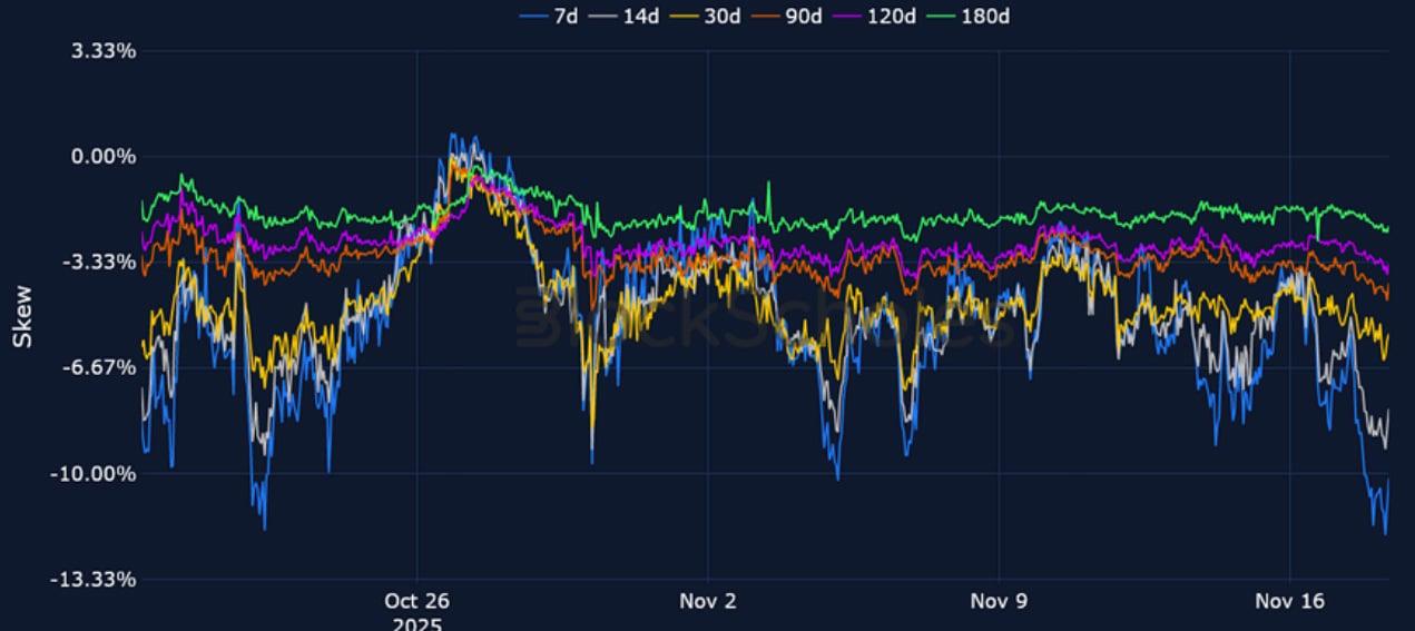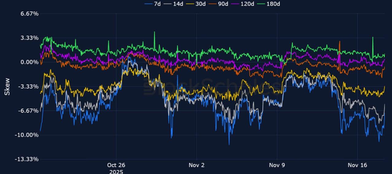Tuần qua đã chứng kiến BTC chạm một loạt mức thấp mới, với các thị trường phái sinh tiếp tục đặt cược rằng đà trượt dốc còn lâu mới kết thúc. Vào ngày 14 tháng 11 năm 2025, BTC đã giảm xuống dưới 97.000 đô la lần đầu tiên kể từ đầu tháng 5 năm 2025. Sau đó, mức này mở rộng lên 93.000 đô la - mức có nghĩa là BTC đã xóa sạch tất cả các khoản tăng từ đầu năm đến nay - và sau đó là 89.000 đô la. Mặc dù giá tài sản tiền điện tử giảm là một phần của động thái giảm rủi ro rộng hơn trong bối cảnh suy đoán ngày càng tăng về bong bóng AI tiềm ẩn và cuộc nói chuyện của Fed cho thấy khả năng tạm dừng lãi suất vào tháng 12, nhưng dù sao thì các mã thông báo tiền điện tử vẫn bị ảnh hưởng nặng nề nhất. Do đó, mức độ biến động ngụ ý trong cả quyền chọn BTC và ETH vẫn ở mức cao, trong khi nụ cười biến động vẫn duy trì xu hướng bảo vệ giảm giá dai dẳng. Đối với ETH, kỳ vọng về biến động gia tăng, đặc biệt là trong ngắn hạn, có nghĩa là cấu trúc biến động đảo ngược có ít dấu hiệu giảm bớt. Trong một dấu hiệu khác của tâm lý bi quan, việc tiếp xúc với BTC và ETH ngắn hạn trên thị trường tương lai cho thấy giá tương lai giao dịch thấp hơn giá giao ngay, cho thấy thị trường sẵn sàng chấp nhận mức giá thấp hơn khi bán khống so với giá giao ngay.