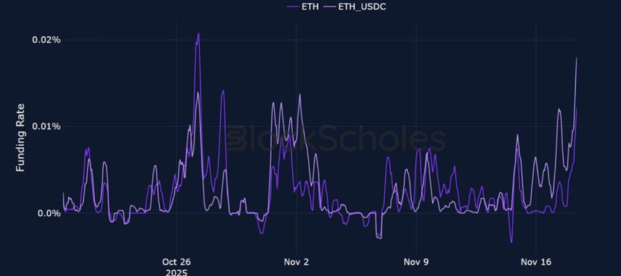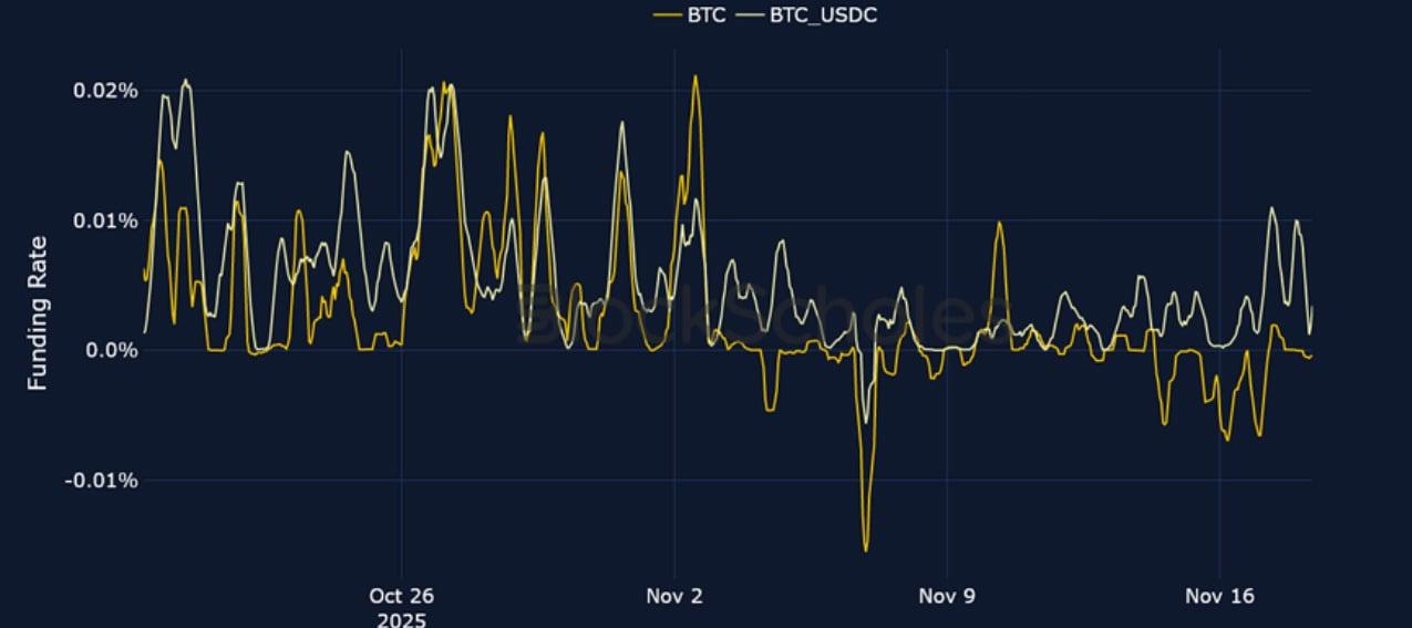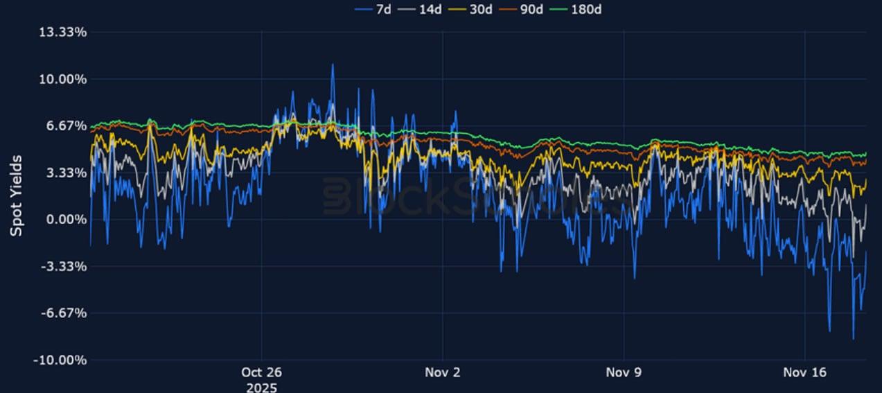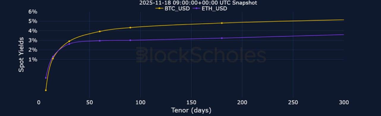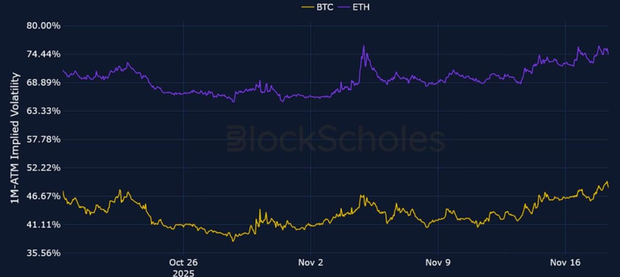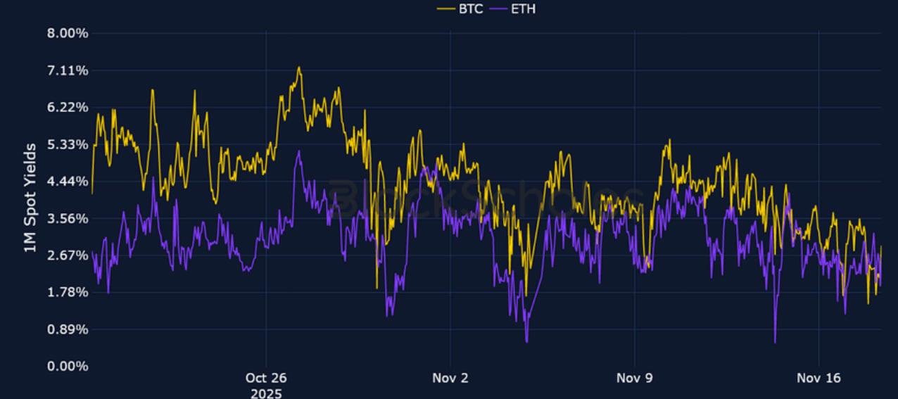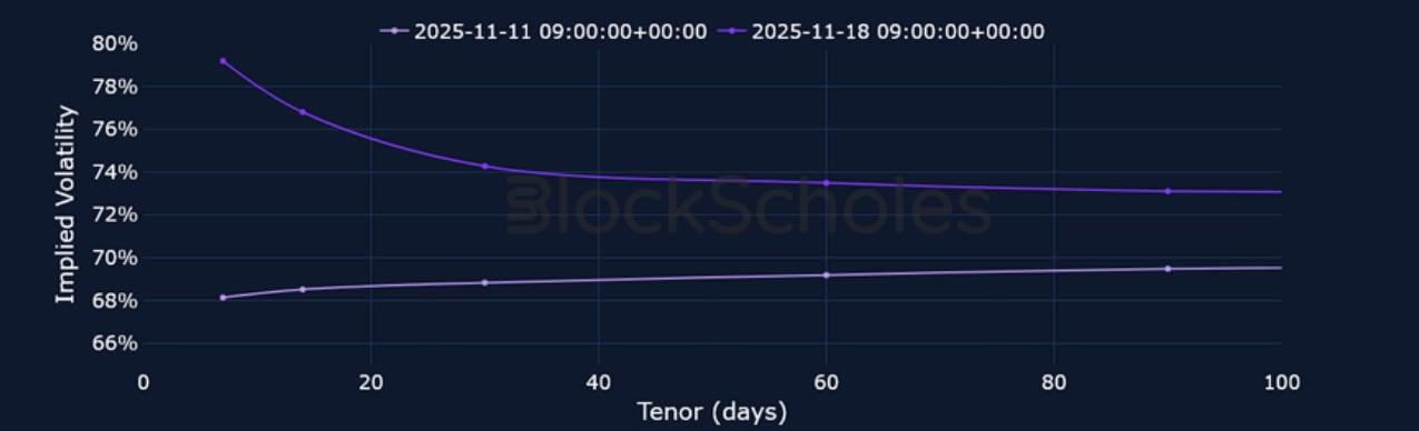Tuần qua đã chứng kiến BTC chạm một loạt mức thấp mới, với các thị trường phái sinh tiếp tục đặt cược rằng đà trượt dốc còn lâu mới kết thúc. Vào ngày 14 tháng 11 năm 2025, BTC đã giảm xuống dưới 97.000 đô la lần đầu tiên kể từ đầu tháng 5 năm 2025. Sau đó, mức này mở rộng lên 93.000 đô la - mức có nghĩa là BTC đã xóa sạch tất cả các khoản tăng từ đầu năm đến nay - và sau đó là 89.000 đô la. Mặc dù giá tài sản tiền điện tử giảm là một phần của động thái giảm rủi ro rộng hơn trong bối cảnh suy đoán ngày càng tăng về bong bóng AI tiềm ẩn và cuộc nói chuyện của Fed cho thấy khả năng tạm dừng lãi suất vào tháng 12, nhưng dù sao thì các mã thông báo tiền điện tử vẫn bị ảnh hưởng nặng nề nhất. Do đó, mức độ biến động ngụ ý trong cả quyền chọn BTC và ETH vẫn ở mức cao, trong khi nụ cười biến động vẫn duy trì xu hướng bảo vệ giảm giá dai dẳng. Đối với ETH, kỳ vọng về biến động gia tăng, đặc biệt là trong ngắn hạn, có nghĩa là cấu trúc biến động đảo ngược có ít dấu hiệu giảm bớt. Trong một dấu hiệu khác của tâm lý bi quan, việc tiếp xúc với BTC và ETH ngắn hạn trên thị trường tương lai cho thấy giá tương lai giao dịch thấp hơn giá giao ngay, cho thấy thị trường sẵn sàng chấp nhận mức giá thấp hơn khi bán khống so với giá giao ngay.