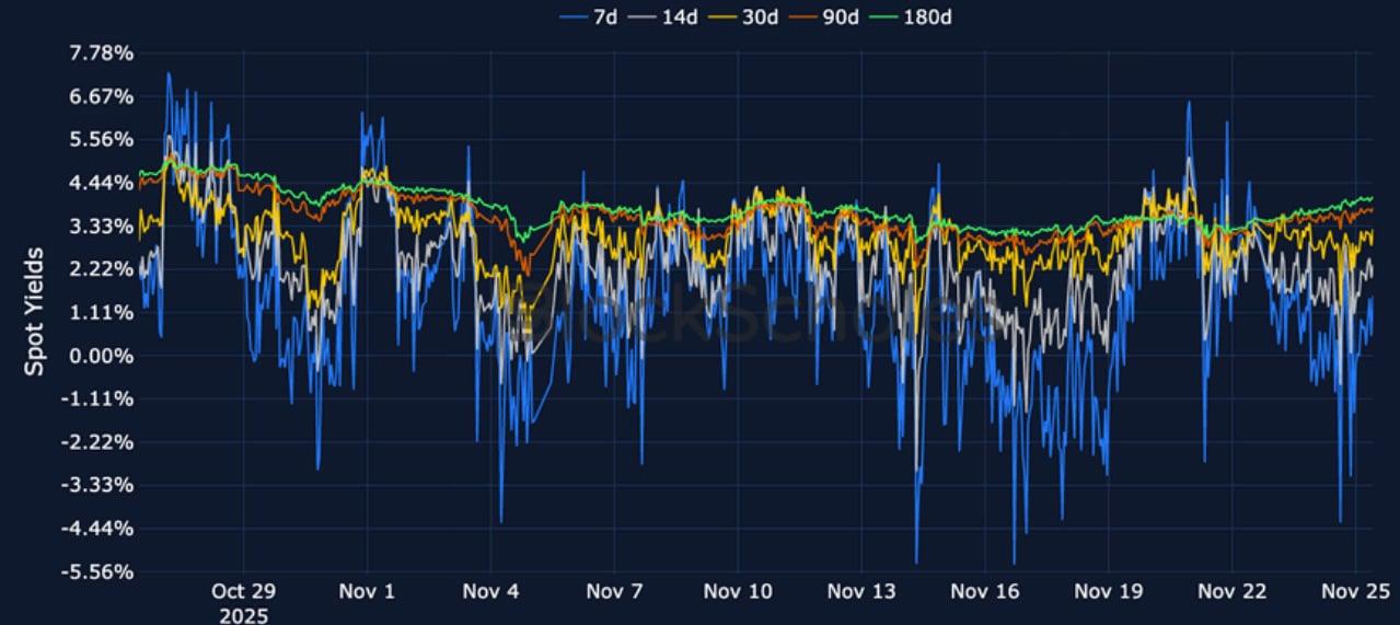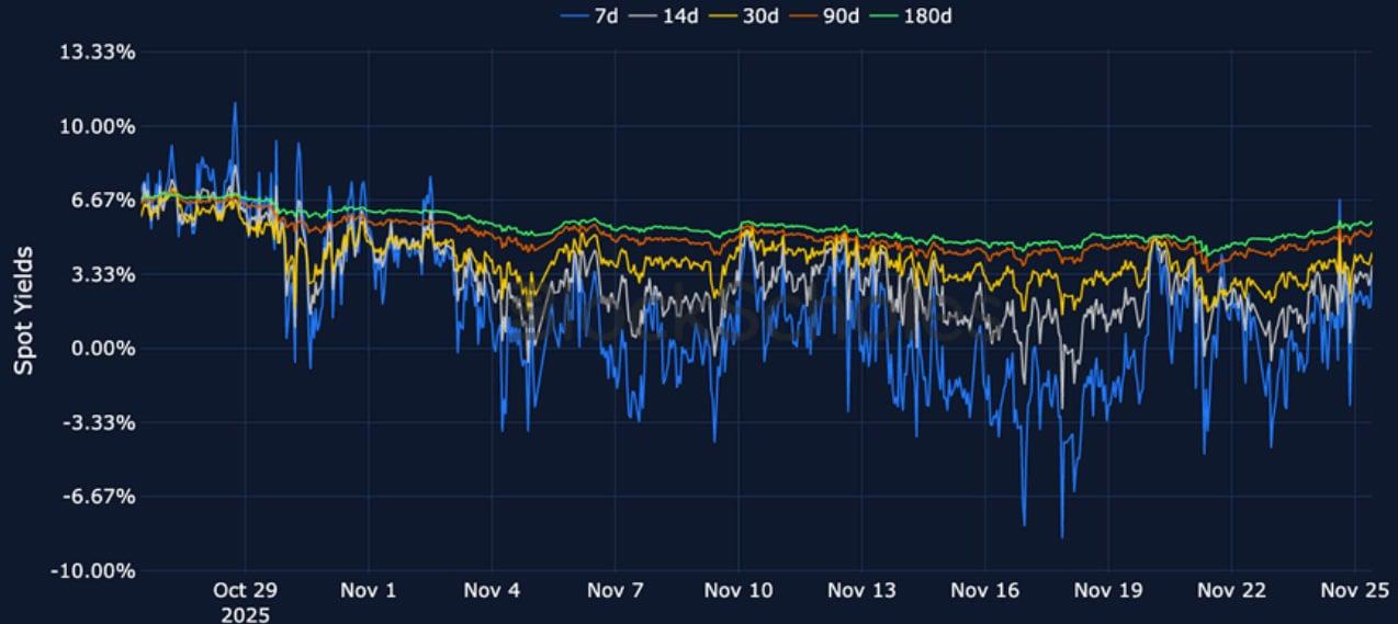 Lợi suất ngụ ý của hợp đồng tương lai ETH – Hợp đồng tương lai ETH kỳ hạn ngắn đã đảo ngược phần lớn mức chiết khấu so với giá giao ngay trong khi hợp đồng tương lai dài hạn giao dịch cao hơn.