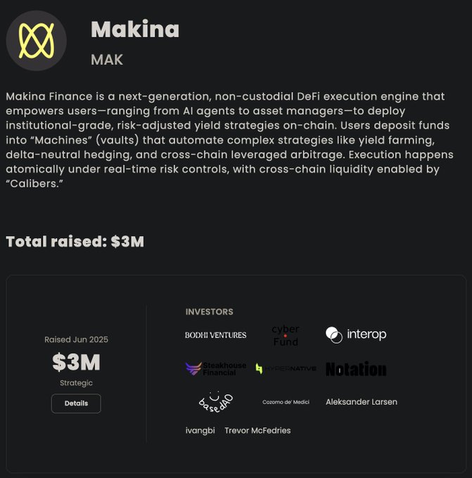 Makina đã gọi vốn thành công 3 triệu đô từ các nhà đầu tư uy tín như Hypernative Labs, Kiln, Cyber Fund, BaseDAO và Bodhi Ventures vào tháng 6/2025, chứng tỏ cam kết về tương lai và tầm nhìn của dự án.